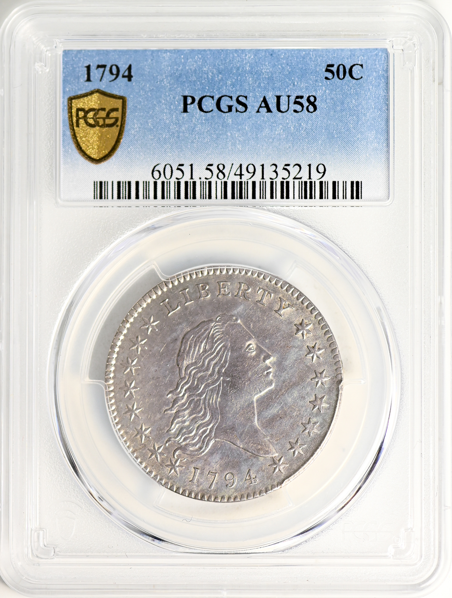 + Free ShippingThe Philadelphia Mint struck its first 5,300 Half Dollars on October 15, 1794. An additional 18,164 examples followed on February 4, 1795 from 1794-dated dies, yielding a total mintage of just 23,464 pieces for this first-year Half. When one considers that the other issue of this type (the 1795) was produced to the extent of 299,680 pieces, the low-mintage, key-date status of the 1794 should be obvious. Indeed, this is an elusive issue in all grades, and most survivors are heavily worn from use in circulation. Even Extremely Fine examples are scarce, and those that grade AU or Mint State and among the rarest Half Dollars of any type or date.