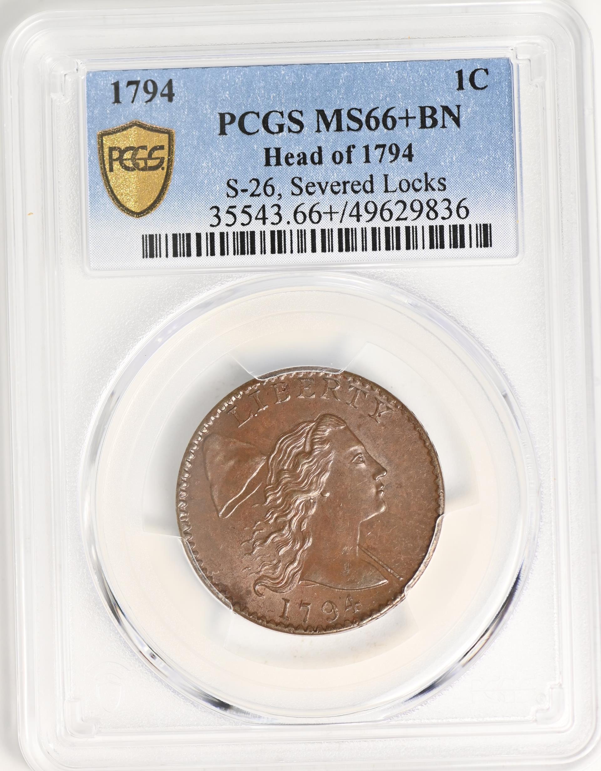 HEAD OF 1794 CENT. GEM LIGHT CHOCOLATE SURFACES. S-26. RARITY-2. THE FINEST KNOWN SHELDON-26.JUST A SINGLE MS67RB GRADED HIGHER FOR THE VARIETY AT PCGS.