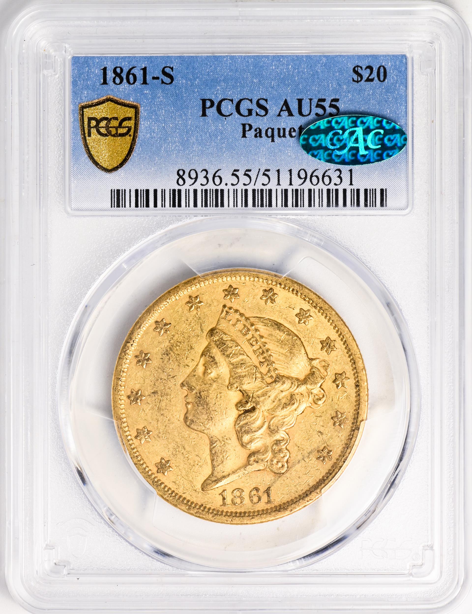Be the first to review “1861-S LIBERTY HEAD $20, PAQUET AU55”